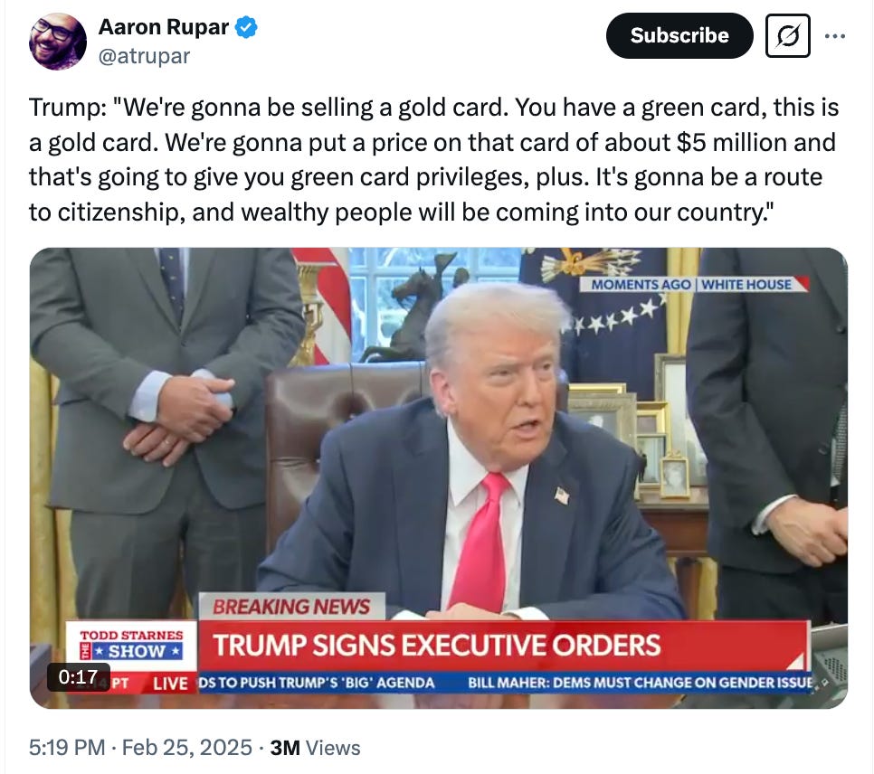 - Foreign oligarchs willing to purchase “Gold Card” citizenship for $5 million; and,