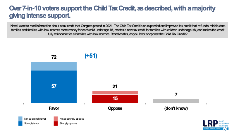 Policies that improve the lives and well-being of children receive strong support from the American people. In the Lake Research Partners poll, voters favor the provisions in the improved Child Tax Credit by a 72-21% margin with parents favoring the policy 77-18%.