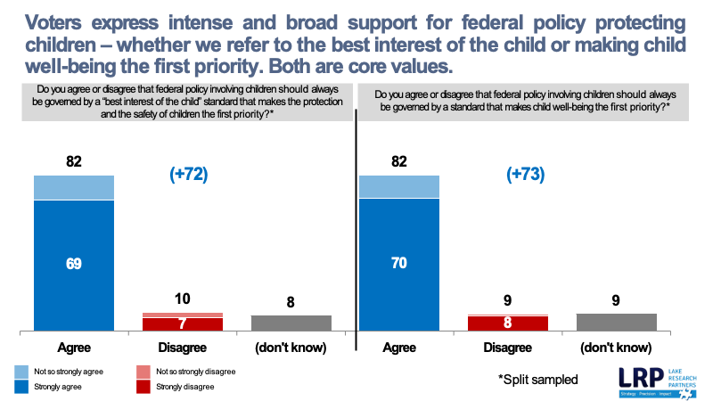 Changes to the Child Tax Credit should prioritize improving the best interests and well-being of children, including reducing child poverty. Voters agree. An overwhelming majority – 82% -10% — agree that federal policy involving children should “always be governed” by a standard that makes the safety, protection, or well-being of children “the first priority.”