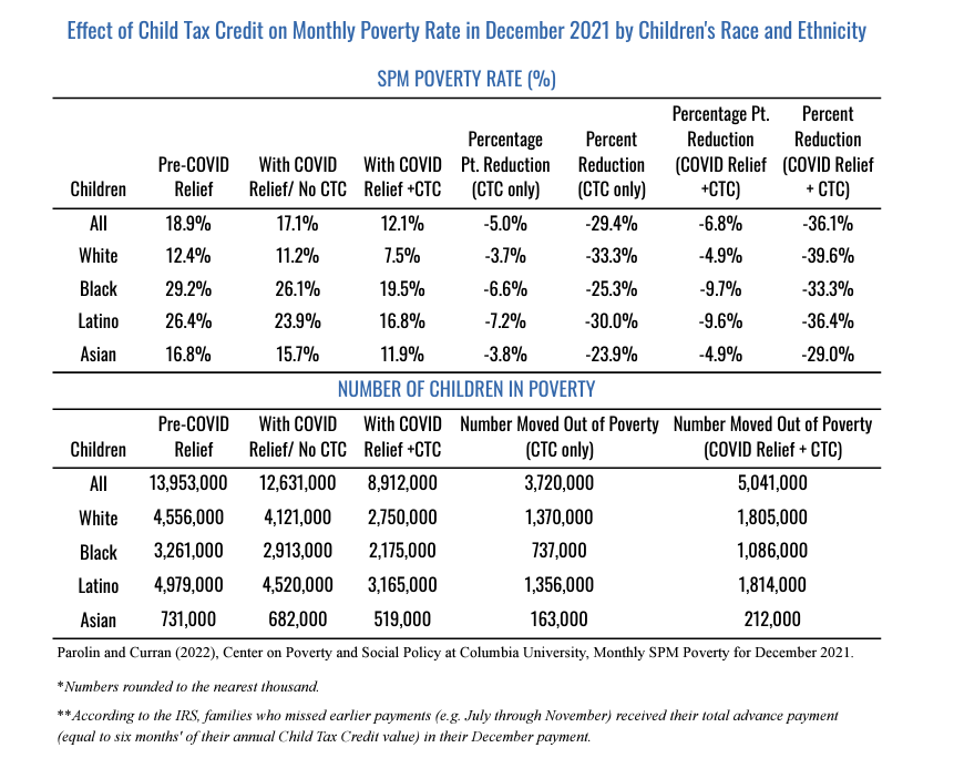2021 was a landmark year for reducing child poverty in the United States. One-year improvements to the Child Tax Credit (CTC) included in the American Rescue Plan Act reduced child poverty by close to 30 percent, keeping 3.7 million children from experiencing poverty at the end of 2021. CTC payments promise an outsized impact on reducing poverty for Black and Hispanic children, many of whom were previously ineligible for the full credit.