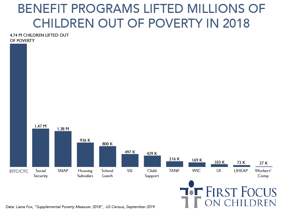 This year’s data shows that tax credits continue to be the strongest anti-poverty tool we have. Together, the Earned Income Tax Credit and the Child Tax Credit lifted 4.7 million children out of poverty in 2018.
