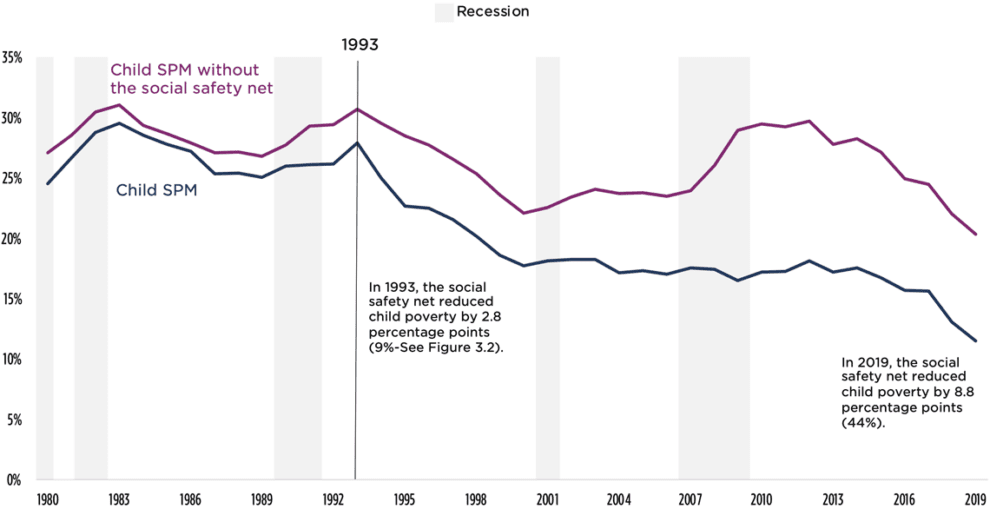 According to the Supplemental Poverty Measure, which includes government assistance such as tax credits, income supports, and nutrition assistance, U.S. policies cut the national child poverty rate nearly in half in 2021, dropping it 4.5 percentage points to 5.2%, the biggest year-to-year decline on record. The research organization Child Trends has tracked a 59% decline in child poverty since 1993. Both analyses identify multiple factors in these declines and highlight the outsized role of public policy improvements through government action.