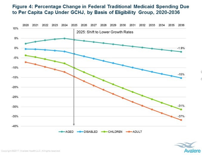 During the health care debates attempted to eliminate the Affordable Care Act (ACA) and to slash Medicaid, the House and Senate put forth proposals to cap Medicaid in ways that would have disproportionately cut funding for children. A study by Avalere Health found that children would suffer the steepest percentage reductions in funding over time – a 31% cut compared to 1.9% for seniors and 15% for people with disabilities – in the 2017 Graham-Cassidy Senate bill.