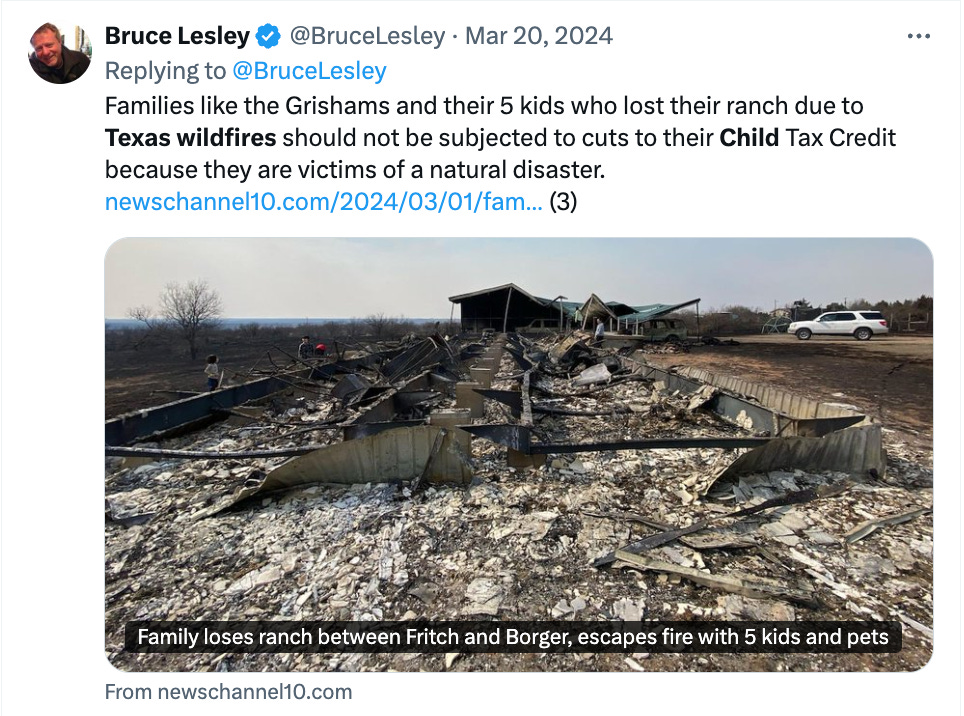 Consider the Grahams, a family that lost their home and farm in the Texas-Oklahoma wildfires this past spring. Their income dropped overnight, which depending on how much it declined for the full year, would make all five of their children ineligible or only partially eligible for the CTC. Their children lost not just their home but also a financial cushion that could have helped them rebuild their lives, replace clothes and school supplies, secure temporary housing, or simply keep food on the table. These are not luxuries but necessities for recovery.
