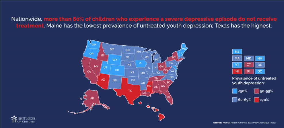 The United States has a severe shortage of pediatric mental health professionals. In fact, typically, 11 years pass between when symptoms first appear and when treatment begins. A heat map produced by Mental Health America in 2022 shows that more than 60% of children who experience a severe depressive episode do not receive treatment. A December 2023 report by the Health Resources Services Administration (HRSA) predicts substantial shortages of child and adolescent psychiatrists, school counselors, and child, family, and school social workers in 2036. In 2022, only two states (Vermont and New Hampshire) were meeting the recommended ratio of school counselors to students.