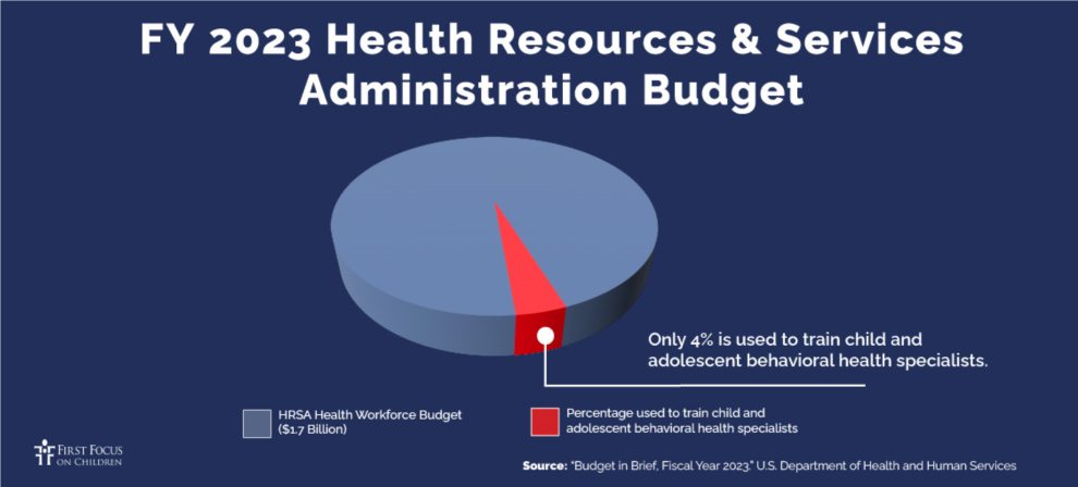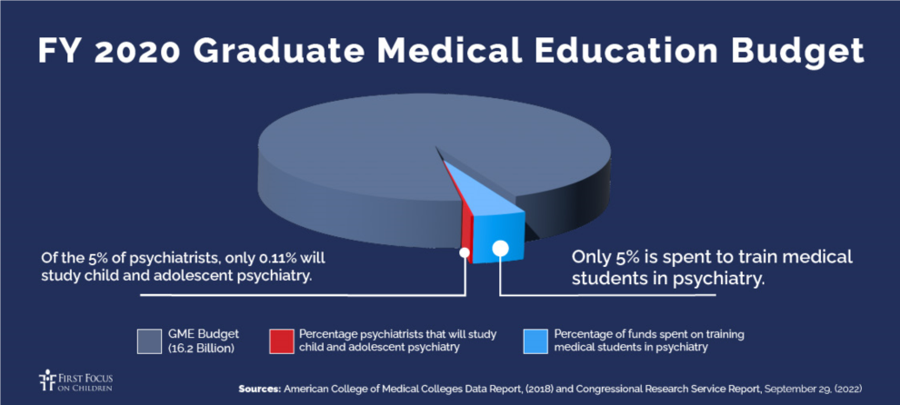 The Graduate Medical Education (GME) program receives roughly $16.2 billion a year in federal funding and provides the primary source of training for the nation’s health care and behavioral health workforce. Of all the students in the GME pipeline, fewer than 5% of students are pursuing psychiatry: Of those students, well under 1% – just 0.11% are pursuing child and adolescent psychiatry. The Health Resources and Service Administration also trains health care professionals. Less than 10% of HRSA’s $1.7 billion workforce development budget is used to develop the behavioral health workforce. Of that budget, just 4% is allocated to training for child and adolescent behavioral health.