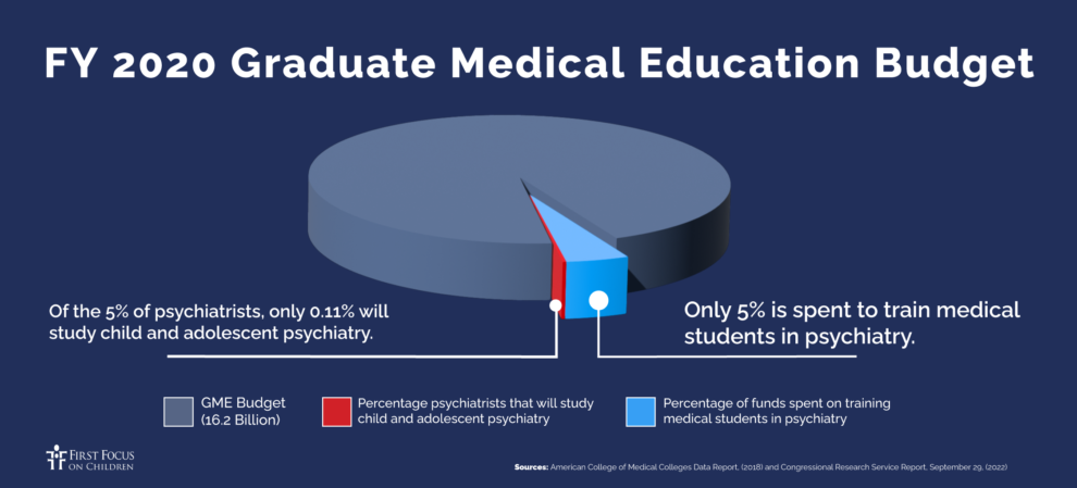 There are likely a few smaller, federal programs that allocate some funding for pediatric mental health training, but GME and HRSA are the largest. Based on those numbers, our country is woefully underinvesting in pediatric behavioral health. Less than 1% of all GME dollars are spent to train child and adolescent psychiatrists. That number alone should sound some alarms in Congress. Similarly, only 4% of HRSA dollars are spent to train child and adolescent behavioral health professionals.