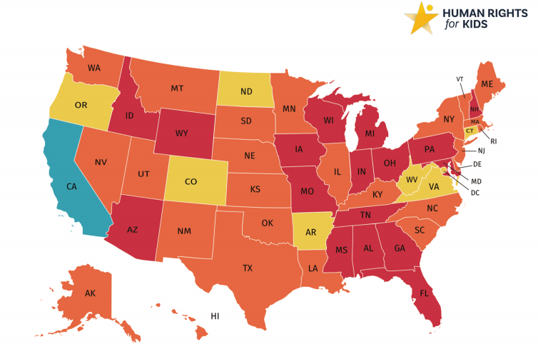 After tabulating each state’s legislative protections for justice-involved youth across 12 categories, such as due process, the felony-murder rule, life without parole, transferring children to the adult criminal system, or housing sentenced youth with adults, Human Rights for Kids ranks states as human rights champions or human rights offenders. The worst offenders include Alabama, Georgia, Maryland, Mississippi, Tennessee, and Wyoming. The research also turns several commonly held beliefs on their heads. For instance, traditionally “blue” or “liberal states” including Maryland, Illinois, New York, Vermont, and Delaware are also among the worst states when it comes to protecting children’s rights in the justice system. Traditionally “red” or “conservative states” including Arkansas, North Dakota, and West Virginia have fared better, with legal frameworks that better reflect “the principle that there is no such thing as a throwaway child.”