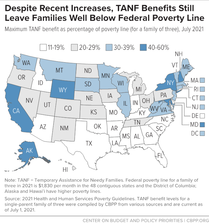 - Establishing a federal minimum benefit so that no family of any race falls below a certain income level. A minimum federal benefit would establish a necessary floor to mitigate the large state-by-state disparities in TANF benefit levels and better protect Black, brown, and white families.