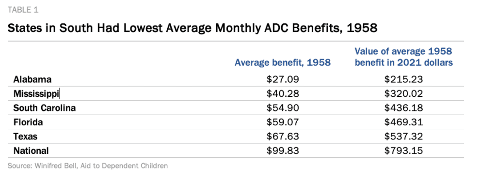 With no federal standard for states to set benefits that met the needs of families, Southern states consistently attempted to keep benefits low. Twenty states set a maximum family grant irrespective of family size by 1958.[13] Fifteen of them were in the South, a region that included half of the country’s Black population.[14] The South was also home to the states with the lowest average ADC benefits in the country as of 1958: Alabama, Florida, Mississippi, South Carolina, and Texas. All five states were well below the national average. (See Table 1.)